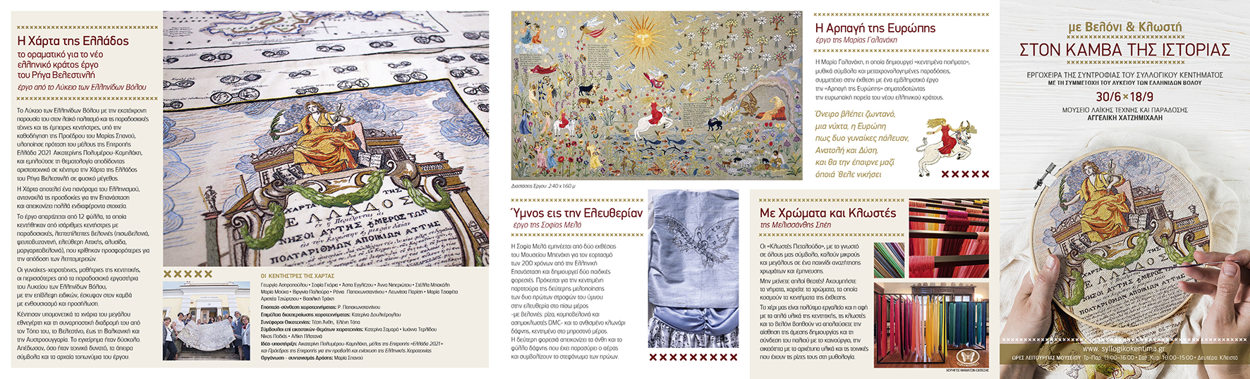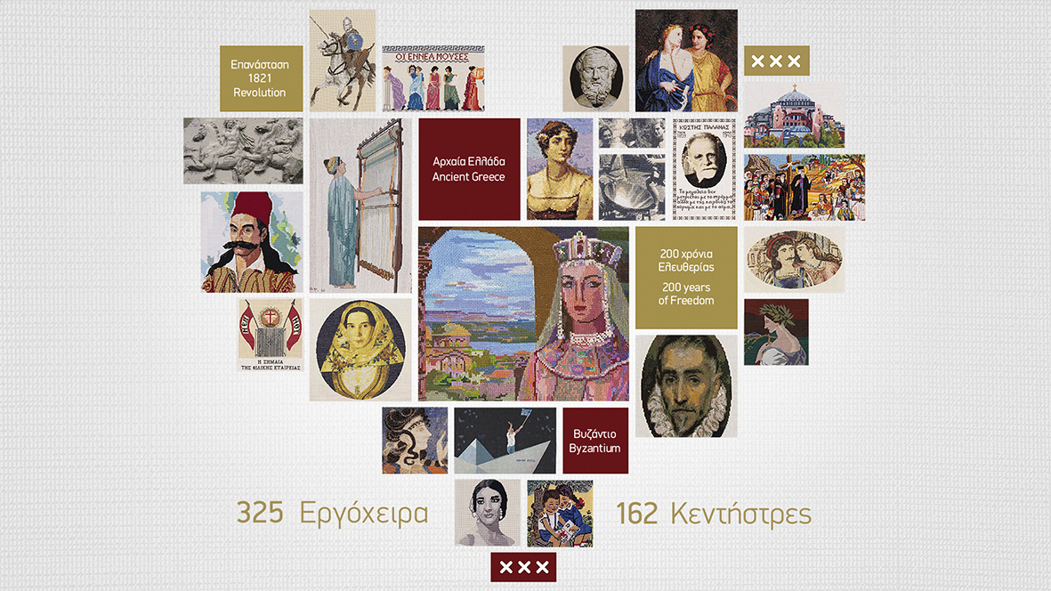 Από τον μύθο της Φιλομήλας και της Πρόκνης, τις Καρυάτιδες, την Θεοδώρα και τον Ιουστινιανό, το «Τη Υπερμάχω» και τον Διγενή, την Χάρτα της Ελλάδος του Ρήγα Βελεστινλή, τον Ύμνο «εις την Ελευθερίαν», τον Κολοκοτρώνη, τον Καβάφη, την Κική Δημουλά ως την «αρπαγή της Ευρώπης» και την πρώτη γυναίκα Πρόεδρο της Δημοκρατίας. Κέντησαν την εικόνα μιας Ελλάδας που έχει τις ρίζες της στον μύθο, απλώνεται στα πέρατα της γης και πάλλεται δημιουργικά μέχρι σήμερα.